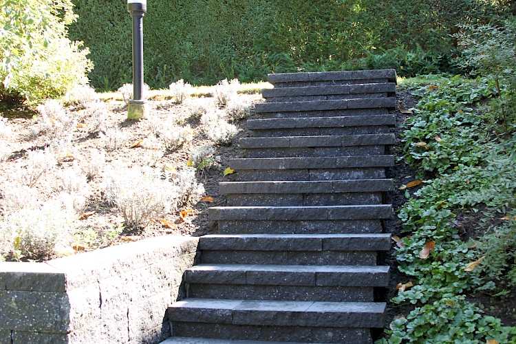 Si les marches sont irrégulières, le nez est toujours réalisé avec un bloc Stackton. La différence peut ensuite être comblée par des dalles de terrasse ou des pavés.